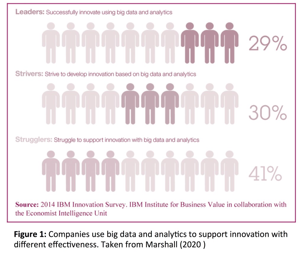 Realisation of BDA benefits requires expertise in not only business management per se but also technological strategy, analysis and ethics. Looking for a place to start can be a daunting prerequisite. So what can help to smoothen the path to its benefits? Medeiros et al (2020) suggested the most important points to embrace revolve around data-driven culture, data strategy training, allocation of investments in analytical technologies and data governance and strategy. Perhaps implementing a data-driven culture in itself provides the structural framework for the other points by placing value in digital entrepreneurship, innovation and service development. In this regard a study by Marshall et al (2015) identified different categories of companies – namely leaders, strivers and strugglers – that use big data for innovation as seen in figure 1.